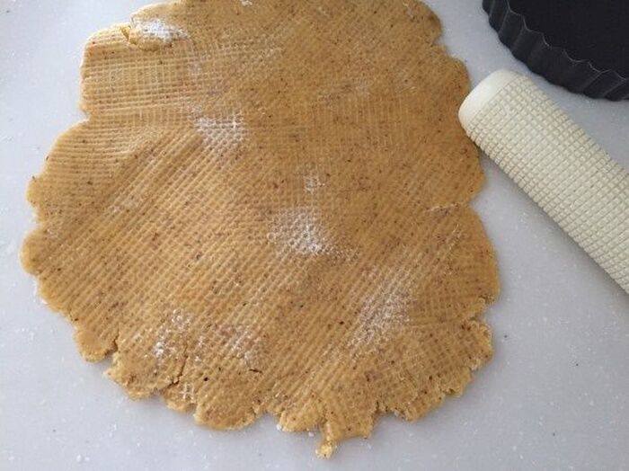 打ち粉(分量外)をふった台の上で 8mm位の厚さにのばし 型にのせる