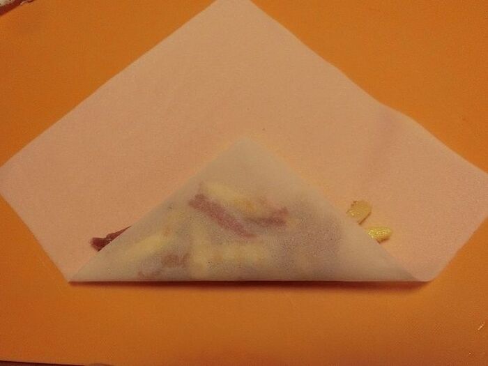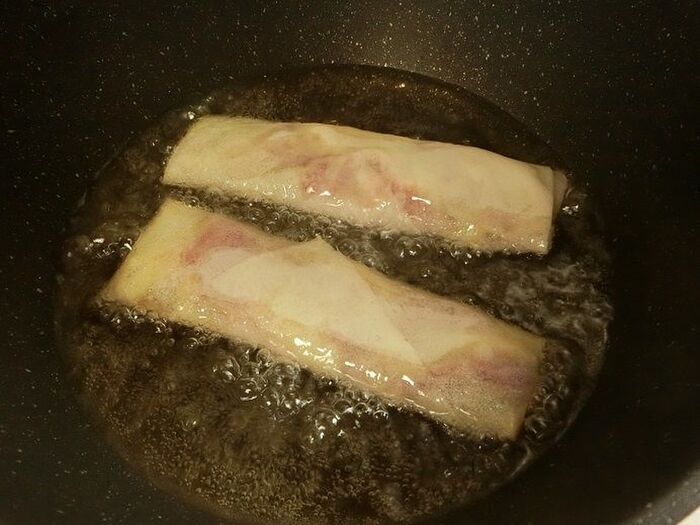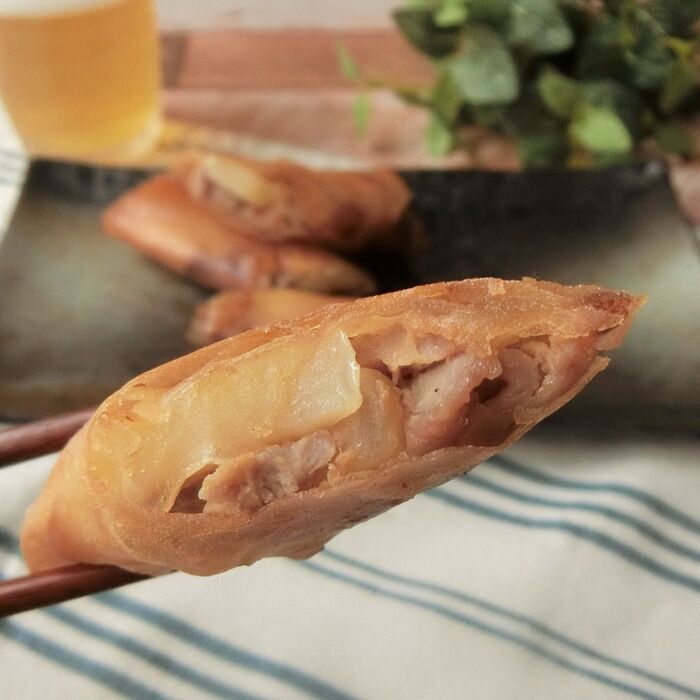 材料を10等分にして、春巻きの皮で巻き、巻き終わりに水溶き小麦粉をつけて止めます。