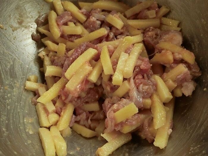 豚肉は細かく切り、フライドポテトは3㎝の長さくらいに切ります。