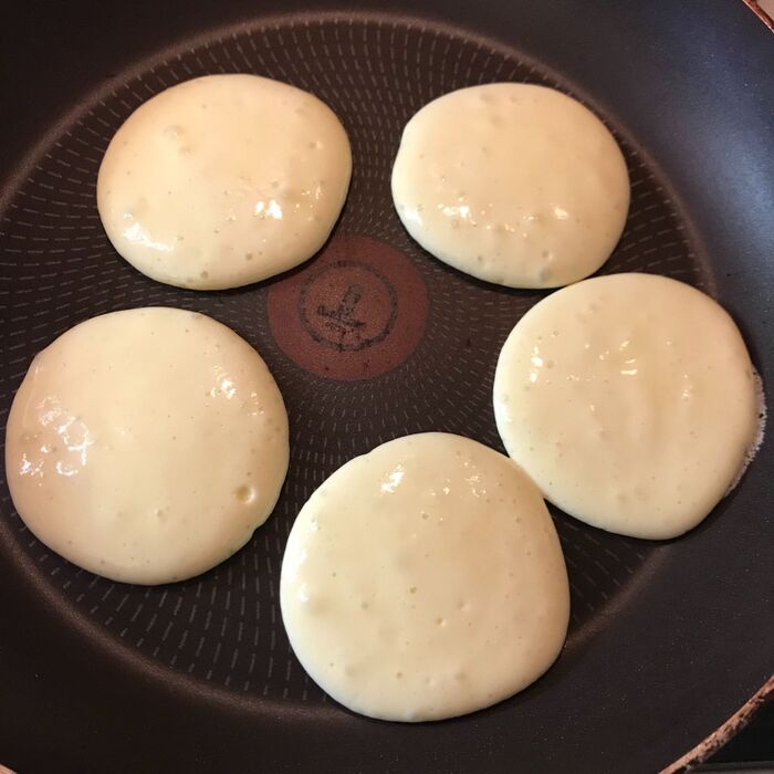 ホットケーキは袋に記載の通りの分量で生地を作ってください。