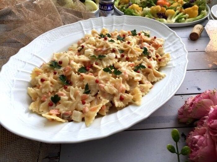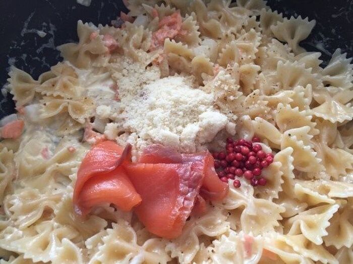 茹でたファルファッレをいれ 全体をよく和え 残りのスモークサーモンと