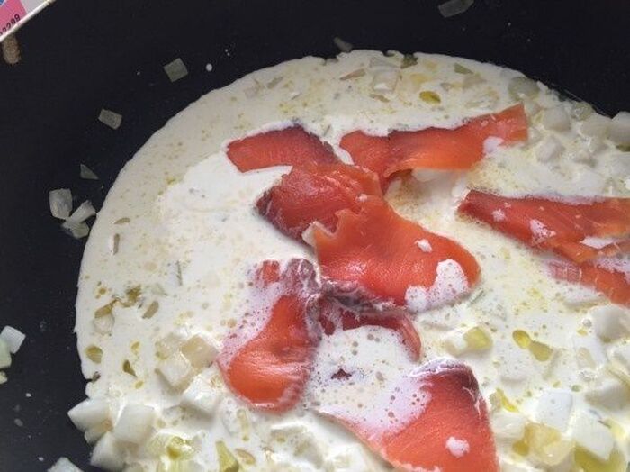 生クリームとスモークサーモンの半量を加え 少し煮詰める