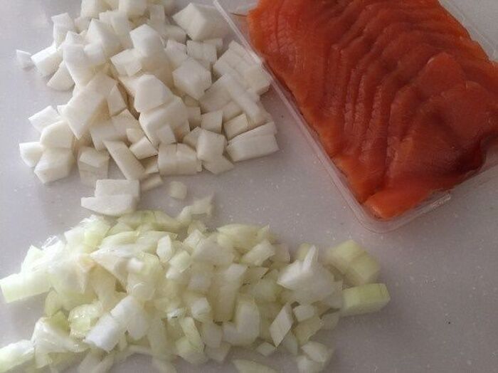タマネギ カブは小さな角切り スモークサーモンは3等分する