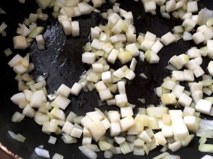 フライパンにオリーブオイルを入れ カブと玉ねぎを炒めかるく塩をふる