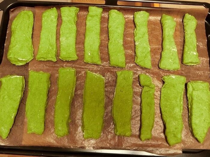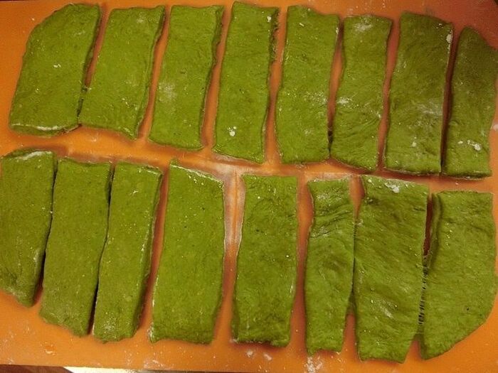 縦20㎝、横25cm位に薄くのばし、スティック状に16等分にします。