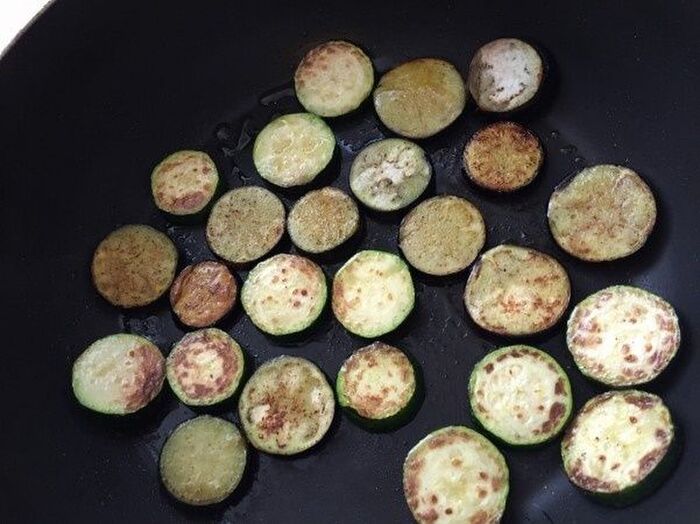 ナスとズッキーニを 1cm幅ぐらいの輪切りにして 半量のオイルを入れた