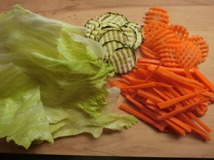 手前にレタス、人参、奥に輪切り人参とズッキーニ、スモークサーモンを置きます。手前からぎゅっと押しつけるように巻いたら完成♪