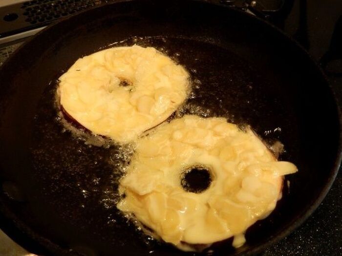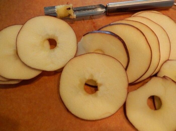 りんごは皮付きのまま芯をくり抜き 5mm厚さの輪切りにしてレモン汁をふる。