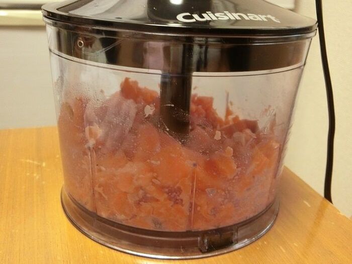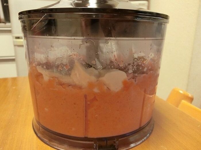 皮と骨を取り除いた塩鮭を小さく切り、ミキサーにかけます。