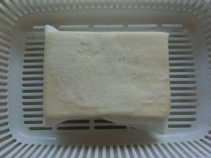 豆腐はキッチンペーパーに包んで重しをし、水切りをします。