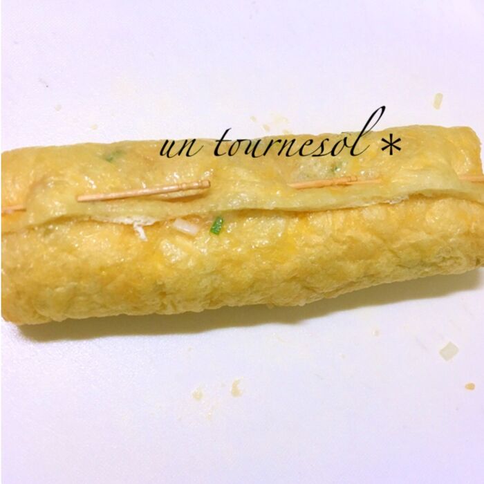 油揚げの長い部分の一部を切り落として、破らないように広げていく。