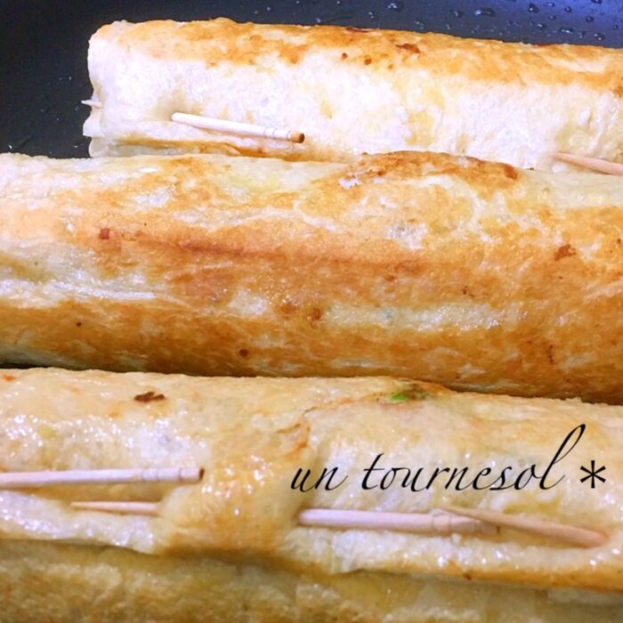 奥の約1cmを残して②をのせ、手前から巻いていき、つまようじでとめる。