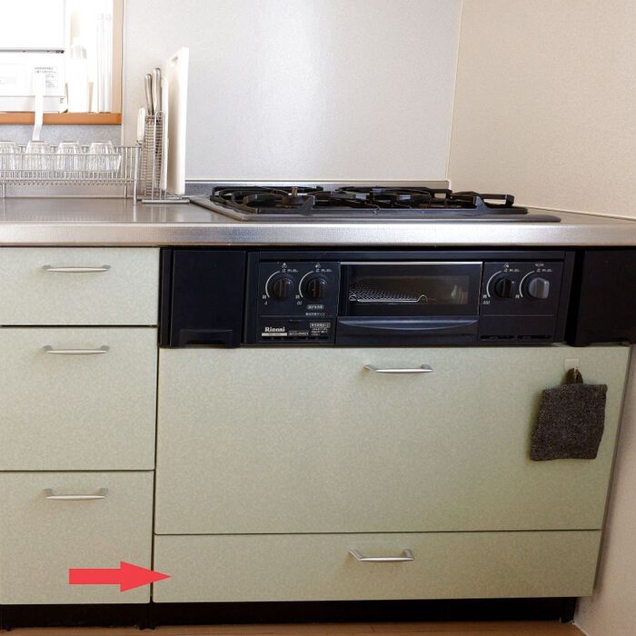 今回は、わが家のコンロ下。高さの低い引き出しです。