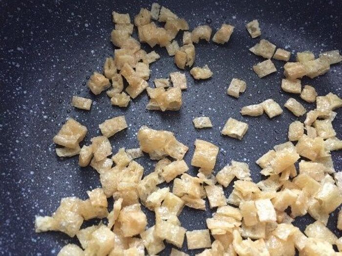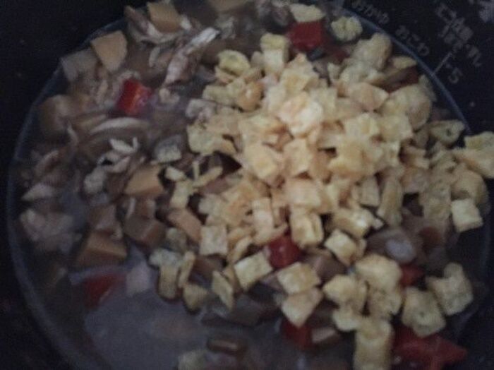 油揚げも具材と同じぐらいの大きさに切ってフライパンで炒めておく