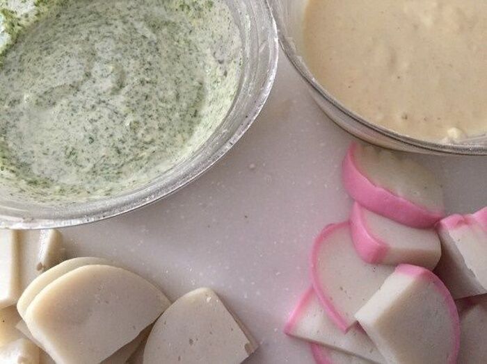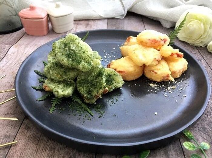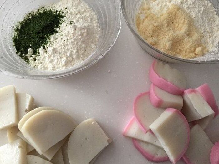 もち粉に塩を少々加え 2等分して青海苔と粉チーズをそれぞれ加え水で溶き