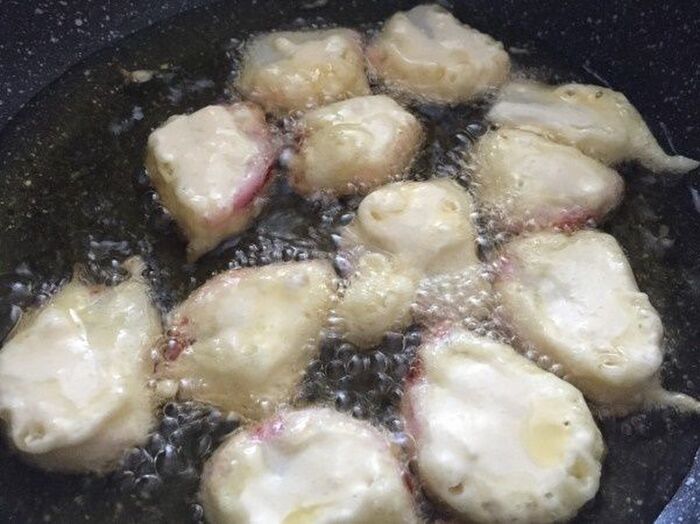 それぞれころもをまぶし 揚げオイルで揚げていく
