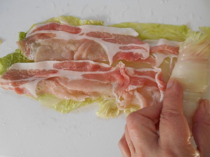 ⑤白菜にお肉をのせ、塩と胡椒各少々をまぶし、白菜の肉厚の部分、切れ目を入れた方から巻いて行く。