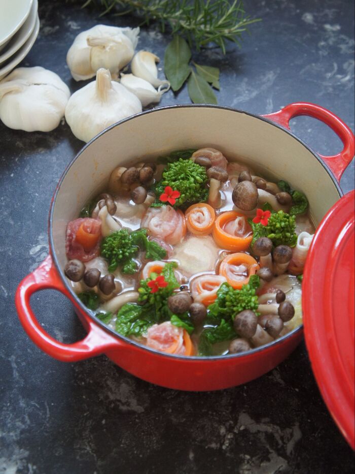 ⑥ ①のスープを注ぎ入れ、巻いた豚肉白菜と生ハム人参を画像の様に置いて菜花を置く。