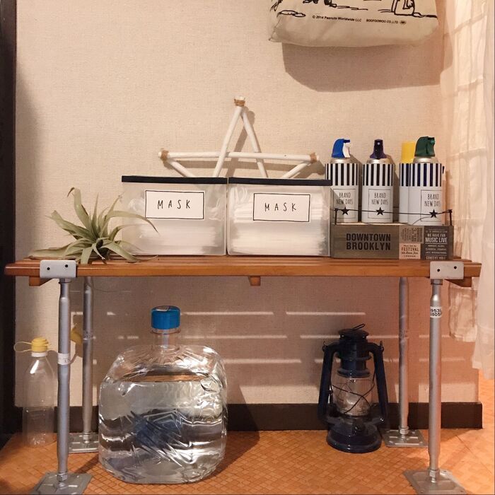 玄関に置いてマスク入れやスプレー缶を置いてます。