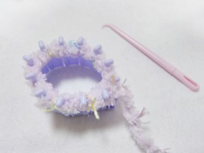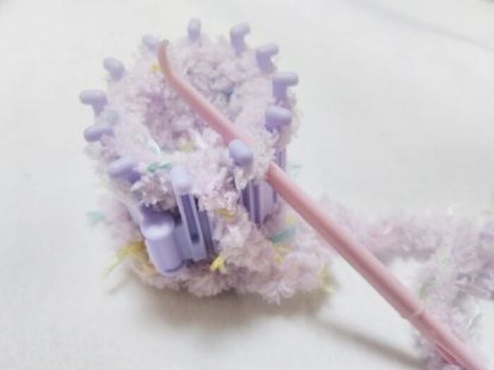 ピンに引っかかっている毛糸の下から編み棒をくぐらせ、編み棒を上へ引き抜きます。ピンにひっかっかている糸をピンから外します。