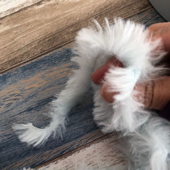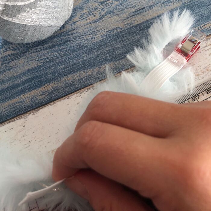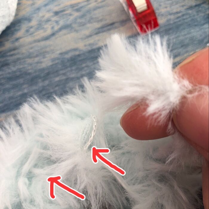 通し終えたら目打ちなどで巻き込んだファーの毛足を整えておきます。