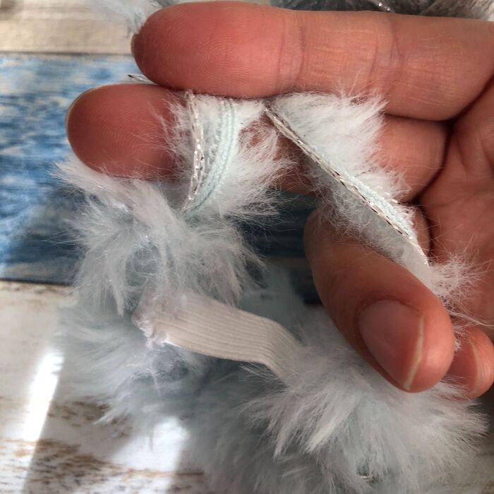 まずはフェイクファーヤーンを鎖編みにしますが、かぎ針ではなく指でゆる〜く編むのがポイントです。