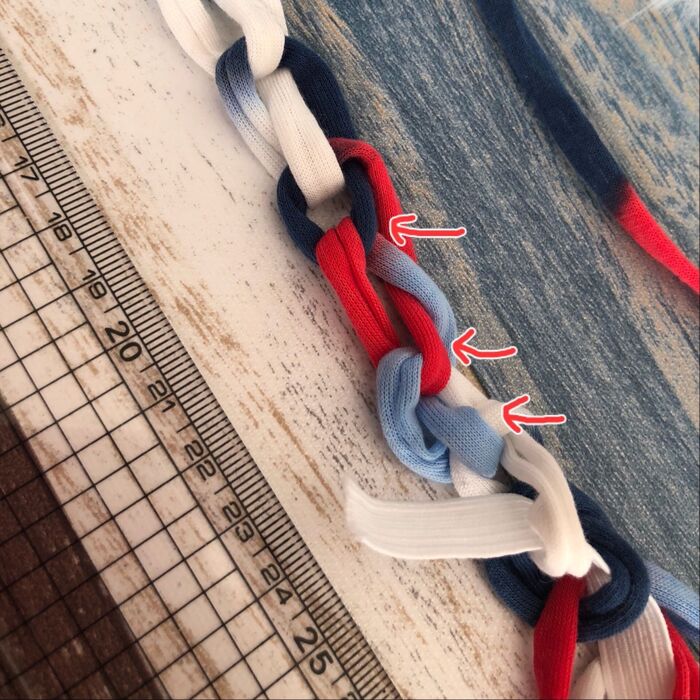 40〜60センチまで編んで5センチ残して糸を切り、穴に通して閉じます。