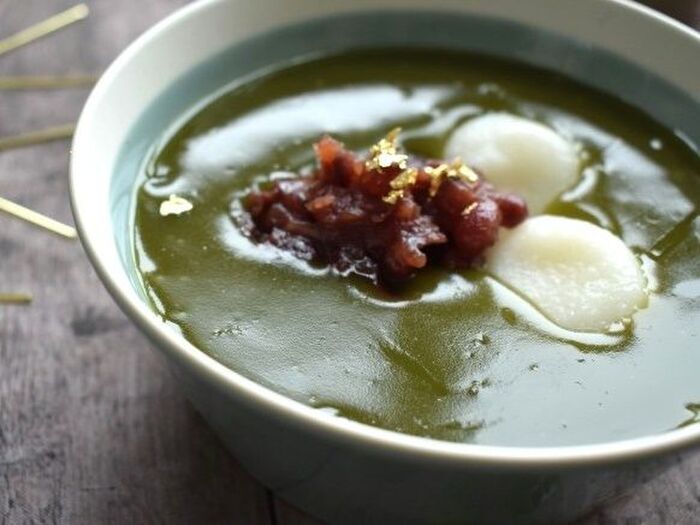 器に注ぎ 粒あん 白玉粉 金箔を添える