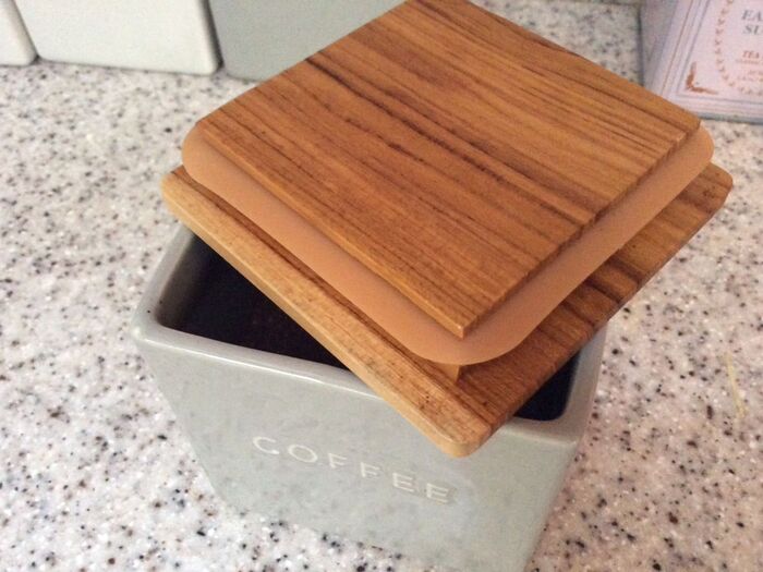 木目の綺麗な蓋の裏には、シリコン製のパッキンが付いているので、湿気が入りません✌️。