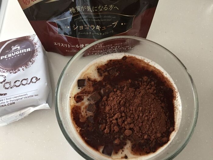 ココアパウダーを加えよく混ぜ合わせ レンジで50秒加熱していったん