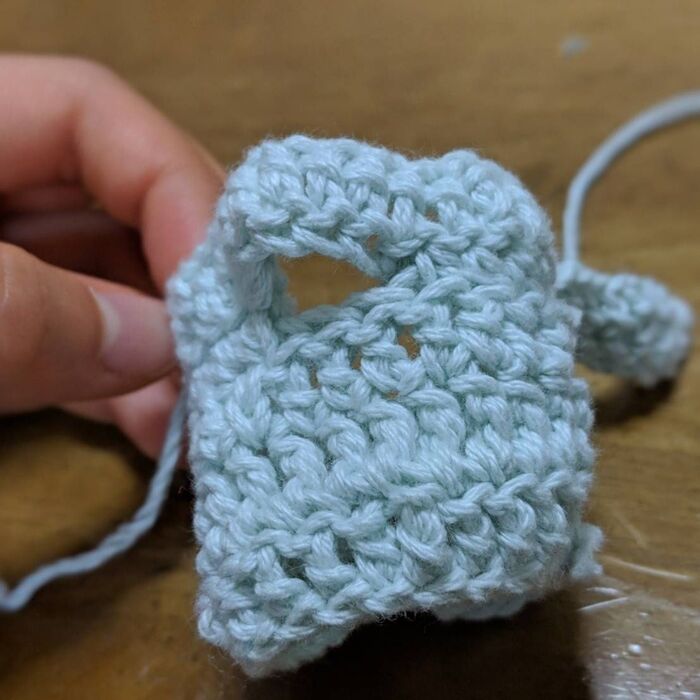 肩上部分左右8編みと、肩下部分左右4編みを残して上下つなげて編みました。