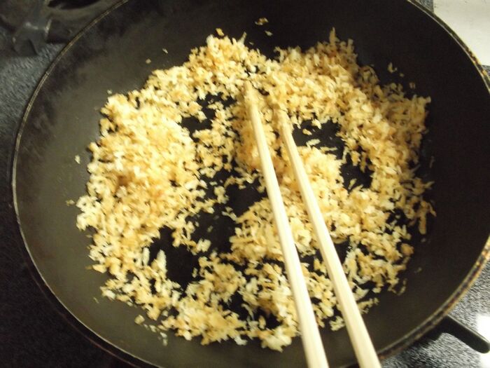小さなフライパンにパン粉とオリーブ油を入れて
