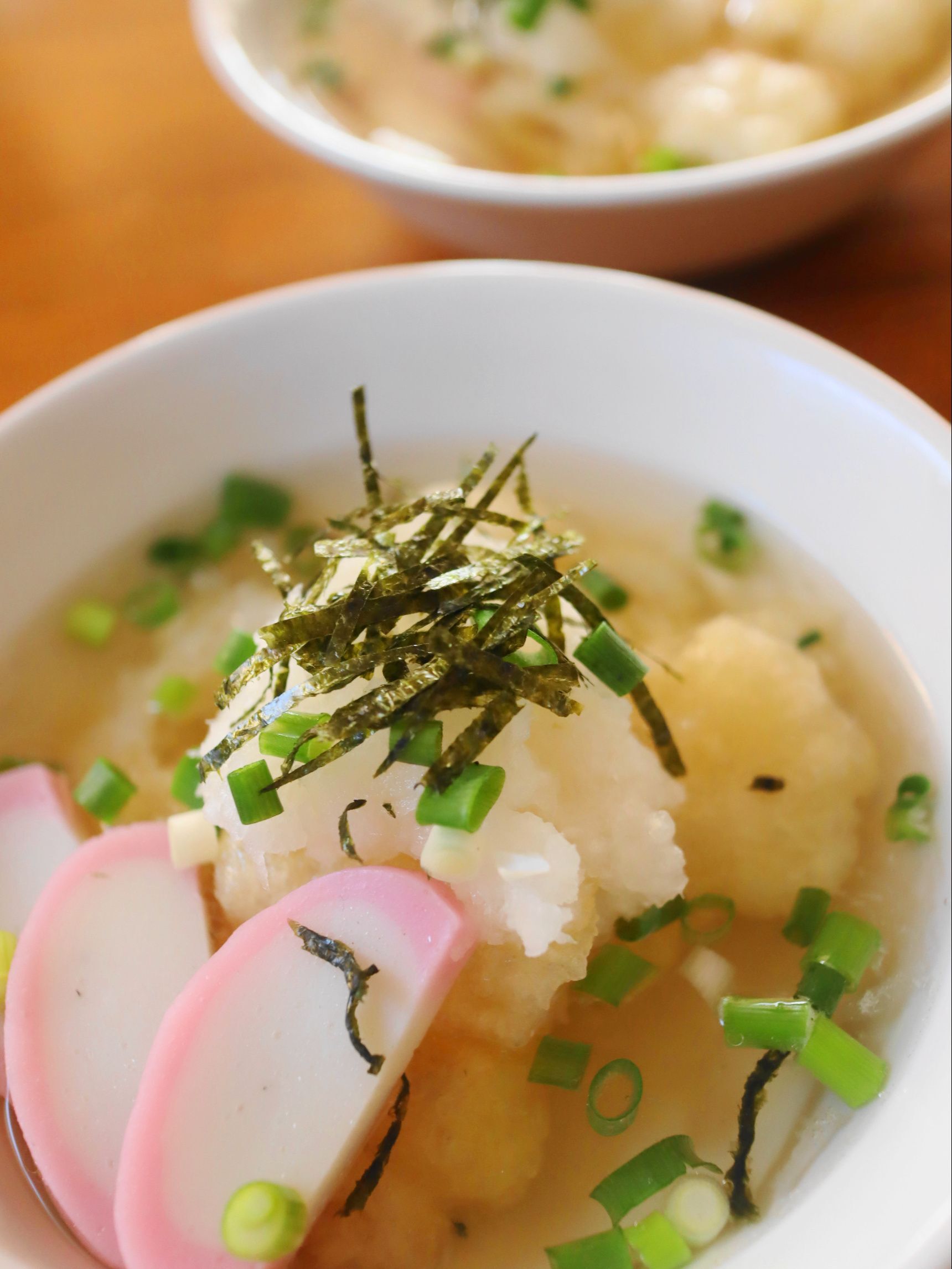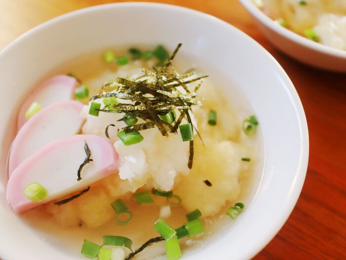 器に揚げたお餅を入れ、だし汁をかけて、おろした大根と細ネギや海苔もかけて完成。