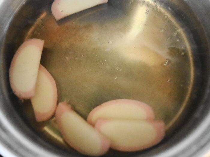だし汁にカットした蒲鉾を入れて味を調えておきます。(お好みで塩、白だし、だし醤油など使用してください)