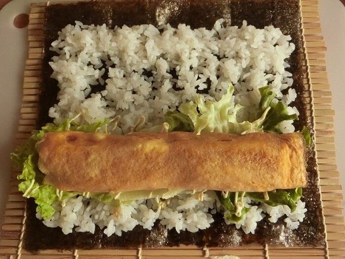 海苔の真ん中あたりにグリーンリーフを乗せ、マヨネーズと卵焼きを乗せます。