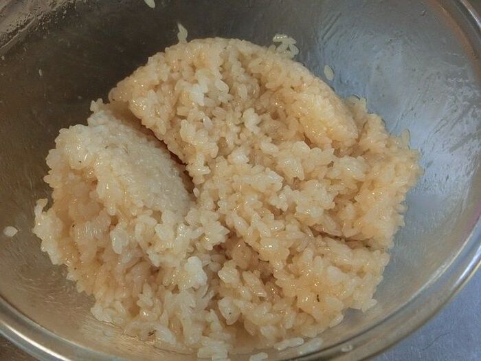 ご飯を酢飯用に炊いて、炊きあがったらすし酢を混ぜ合わせ冷ましておきます。