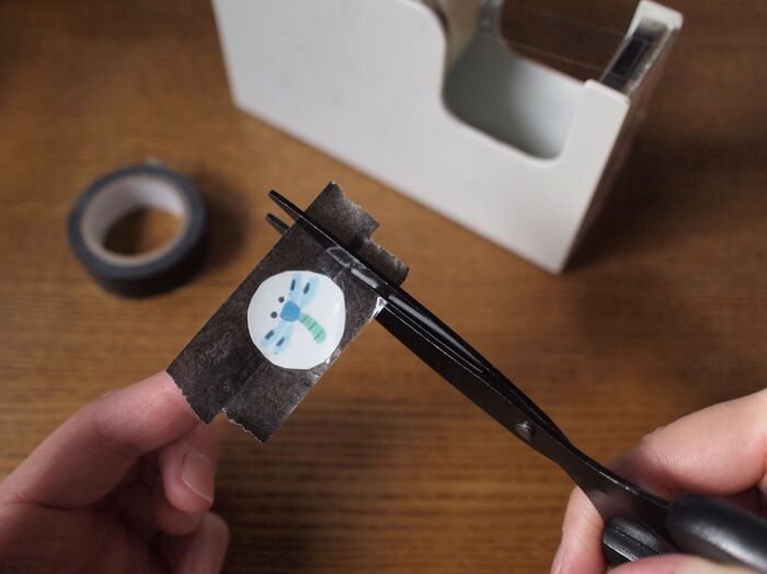 ②下駄箱の棚に合わせた黒のマスキングテープの上にセロテープでマークを貼り付ける