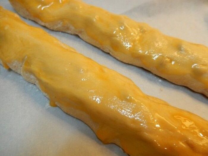 台に粉をはたき(分量外)生地を2つに分け 縦横2cmぐらいの棒状に成型して 溶き卵を塗り 190°のオーブンで20分ぐらい焼く