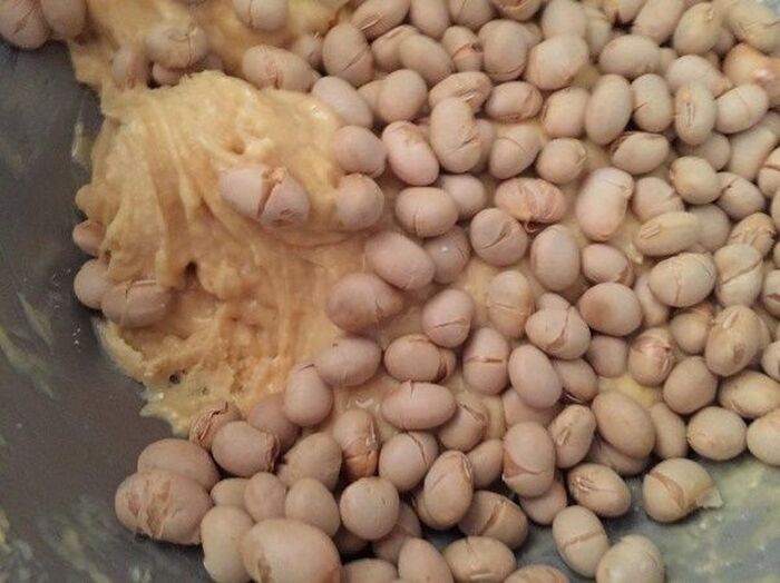 ふるった薄力粉とベーキングパウダーを加え 生地全体に節分豆を混ぜる