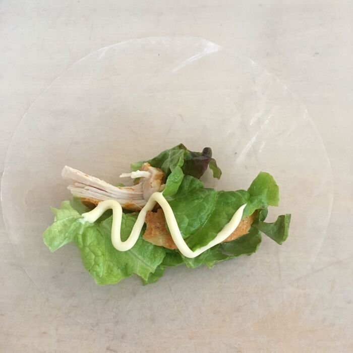 サニーレタスとほぐしたサラダチキンを乗せ、好みでマヨネーズをしぼります。