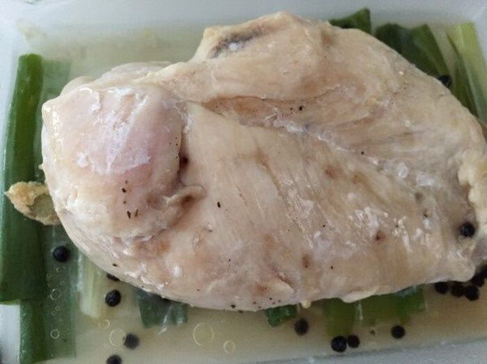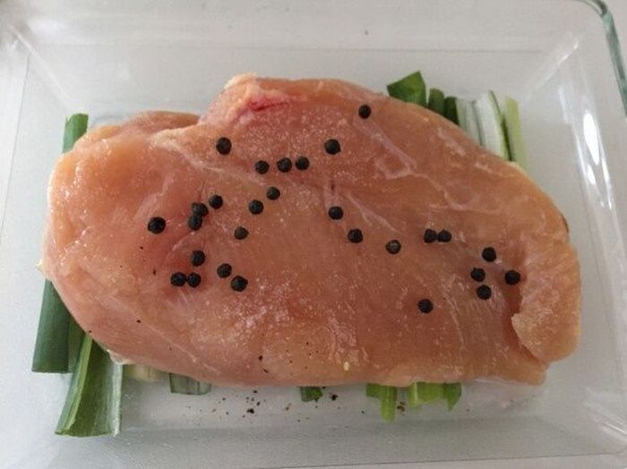鶏むね肉に塩を全体にまぶし ねぎの上にのせ 日本酒と黒コショウを加える