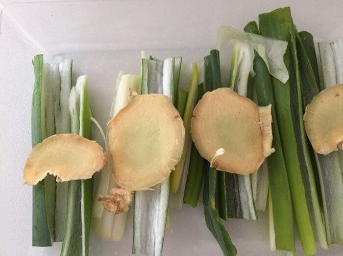 耐熱皿に 縦半分に切った長ねぎの青い部分と薄切りの生姜を敷き詰める