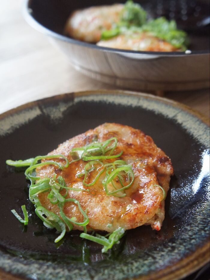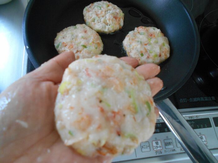 4等分に分けて丸めて、中火で温めたフライパンに米油大さじ1を加え並べてきつね色になるまで両面焼いたら完成。