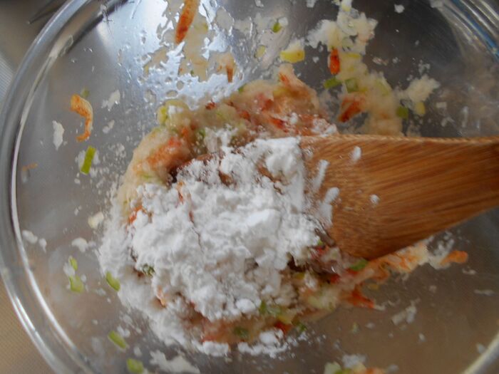干し海老、細かく切ったネギ、塩、かつお顆粒、胡麻油、片栗粉を入れて混ぜ一つにまとめる。