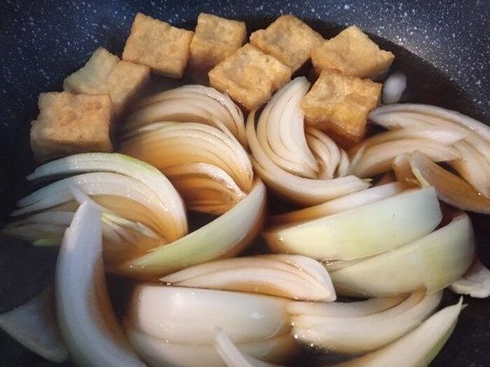 だし汁に 醤油 みりん 砂糖を入れ 沸騰したら 8等分に切った厚揚げ