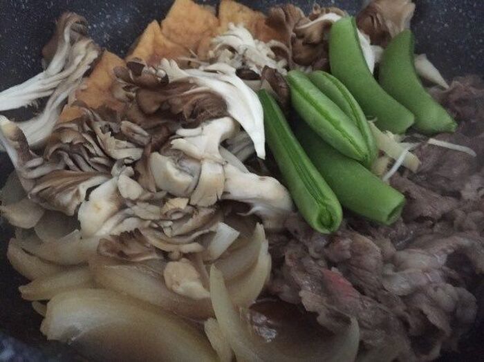 小房に分けた舞茸とスジをとったスナップエンドウを加え 3~4分煮る