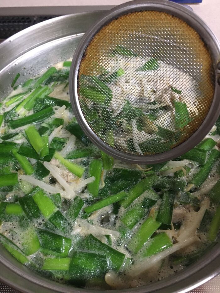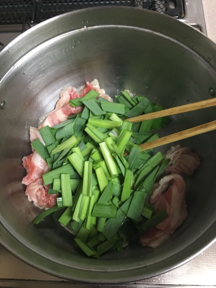 鍋にごま油をしき豚バラ、ニラを炒めます。