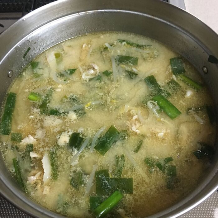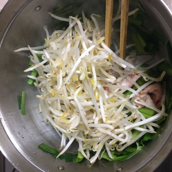 豚バラの色が変わったらもやしを入れ、水、ほんだしを入れます。