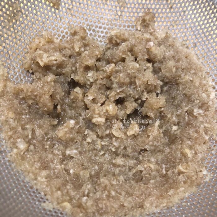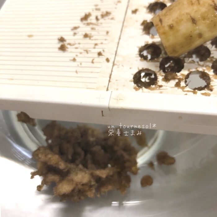 *すりおろすのが面倒な方は、ある程度小さく切ったごぼうと水をミキサーにいれて撹拌してもOK!→その際は水洗いなしで。