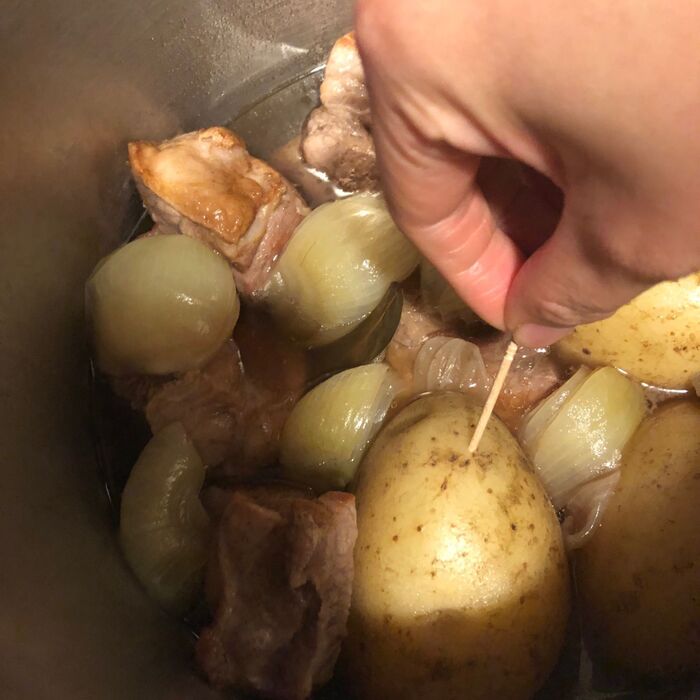 加圧が済んだらジャガイモとお肉に火が通ってるか爪楊枝を刺して確認してください。